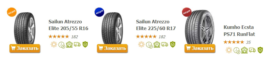 Статус бонуса отображается в подборе по типоразмеру для каждого из предложений и может иметь вид значка АКЦИЯ или плашки с надписью:
